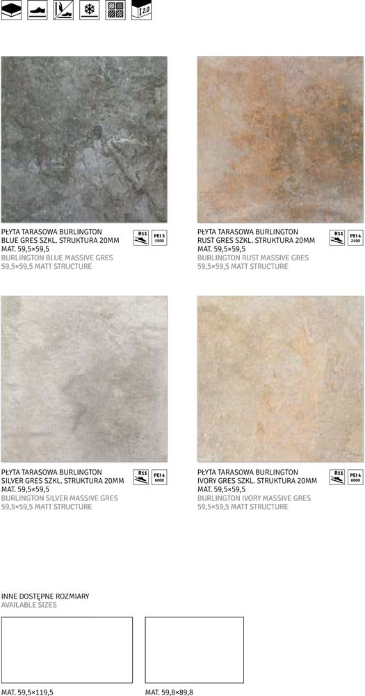 Дизайн, повторяющий по рисунку и фактуре натуральный камень, позволяет подобрать плитку коллекции Burlington в соответствии с индивидуальными потребностями и создать оригинальное и неповторимое пространство. Крупноформатный размер (59.5x59.5 см, 59.5x89.5 см и 59.5x119.5 см), органично-матовая фактура и сдержанные оттенки (песок – слоновая кость, коричневый – ржавый, серебристый, темно-синий) идеально сочетаются с природой, образуя единое целое. Морозостойкая глазурованная керамогранитная террасная плитка Burlington представляет собой сочетание современности и непревзойденной практичности. Элементы коллекции имеют толщину 2 см.
