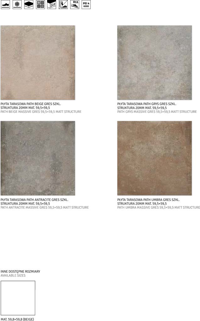 Нежные оттенки серого, характерные для горных пород естественного происхождения, создают динамичный тональный рисунок, напоминающий горную тропу. Благодаря идеально ровным краям ректифицированные плитки можно укладывать с минимальным количеством затирки, создавая эффект однородной поверхности. Эти плитки отличаются простотой монтажа и демонтажа. Их можно укладывать на траву, гравий или песок без привлечения специальной техники, специалистов и дополнительных строительных материалов. Увеличенный формат 59,5x59,5 см подчеркивает простор как интерьера, так и обустроенного внешнего пространства. Благодаря высоким техническим параметрам, включая толщину до 2 см, устойчивость к высоким и низким температурам и высокую прочность, керамогранит Path идеально подходит для открытых площадок и коммерческих помещений – террас, подъездных путей к гаражам, офисов, гостиниц или ресторанов.